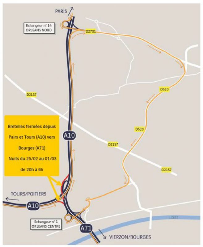 En prévision des travaux d’aménagement de la bifurcation A10/A71, certaines bretelles seront ponctuellement fermées du 25 février au 1er mars, uniquement la nuit, pour limiter la gêne à la circulation en journée.