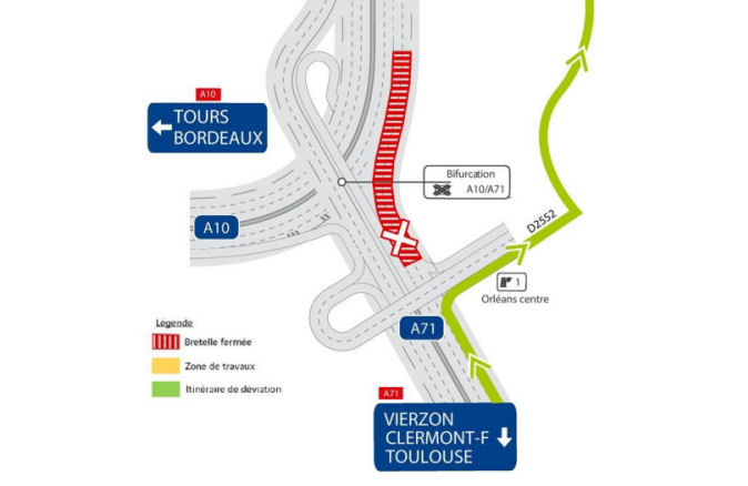 ● Entre la bifurcation des autoroutes A10/A71 et la sortie Orléans nord (n°14), le trafic sera basculé sur la chaussée opposée. Les usagers circuleront sur une seule voie.
