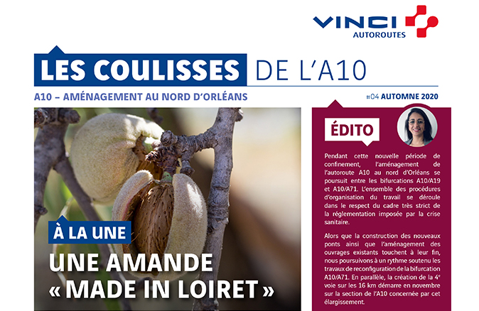 À la Une vous découvrirez la mise en valeur de l’amande du Loiret dans le cadre des compensations agricoles que l’entreprise garantit sur ce chantier. VINCI Autoroutes, qui mène une politique visant à préserver le milieu naturel et la biodiversité et à réduire l’impact de ses activités autoroutières à travers la démarche ERC (Éviter, Réduire, Compenser), participe à hauteur de 100 000 € à la création de cette micro-filière avec la plantation de 10 000 amandiers…