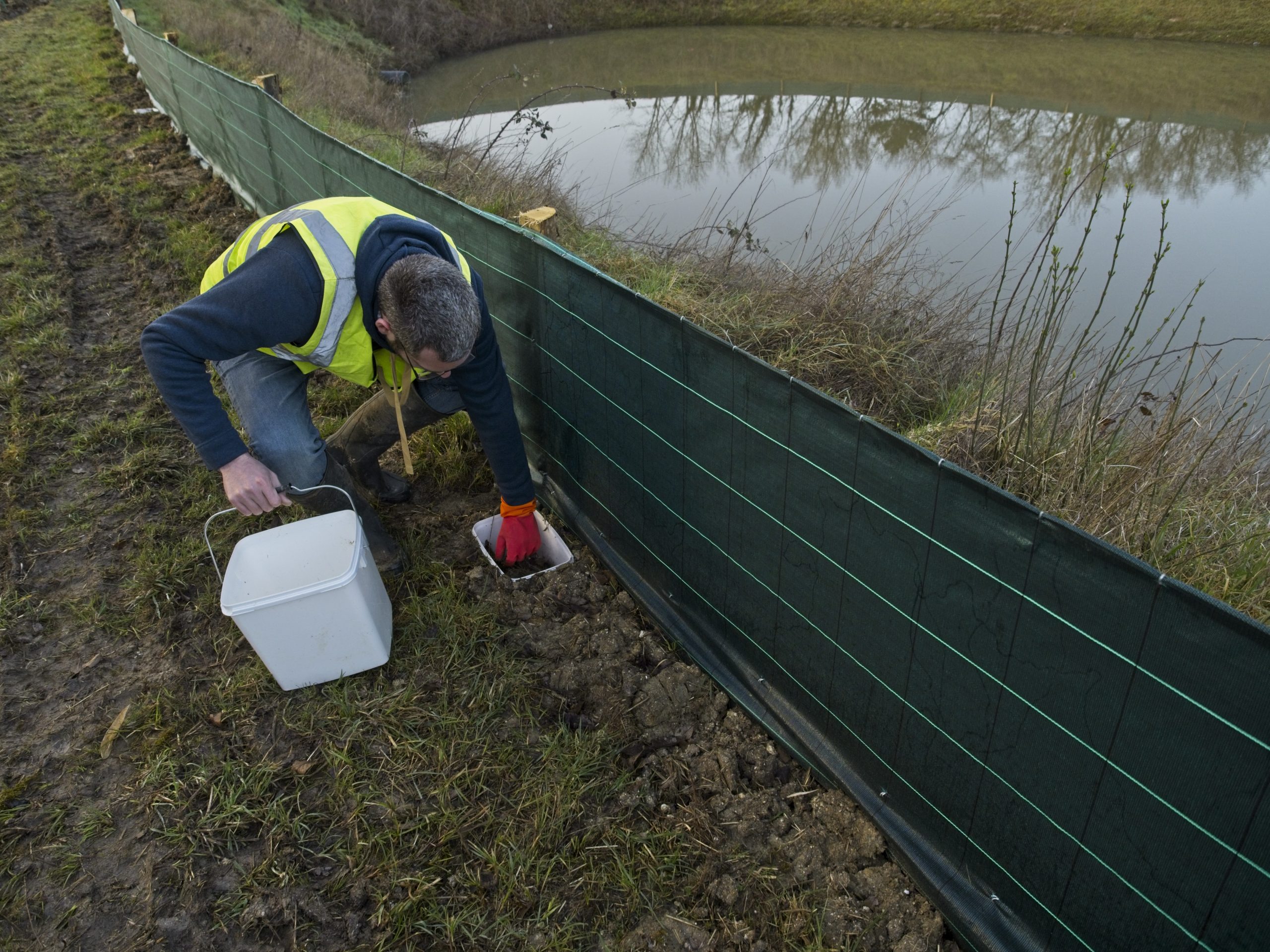 Par exemple, un système de barrières et de seaux placés dans le sol permet d’attraper les crapauds, une espèce dont les individus évoluent entre terre ferme et milieu aquatique, nécessaire à leur reproduction. C’est lors de ces déplacements qu’ils seront guidés, grâce à une barrière disposée le long de la berge, vers un seau positionné sur leur passage, à fleur de sol, avec toutes les précautions d’usage pour qu’ils ne se blessent pas.