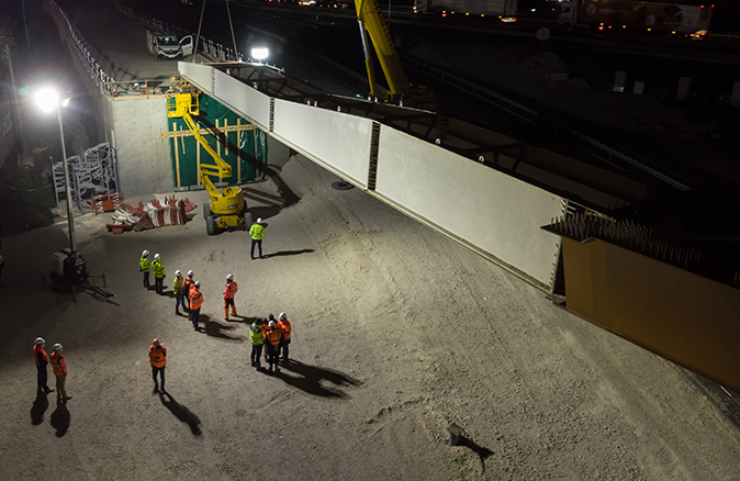 Les compagnons du chantier ont œuvré toute la nuit pour mener à bien cette opération d’une grande précision, sous l’œil attentif de Marc BOURON, directeur général adjoint de l’exploitation de VINCI Autoroutes et directeur général de Cofiroute, et de Christophe HUG, Directeur général adjoint de la maîtrise d’ouvrage de VINCI Autoroutes.