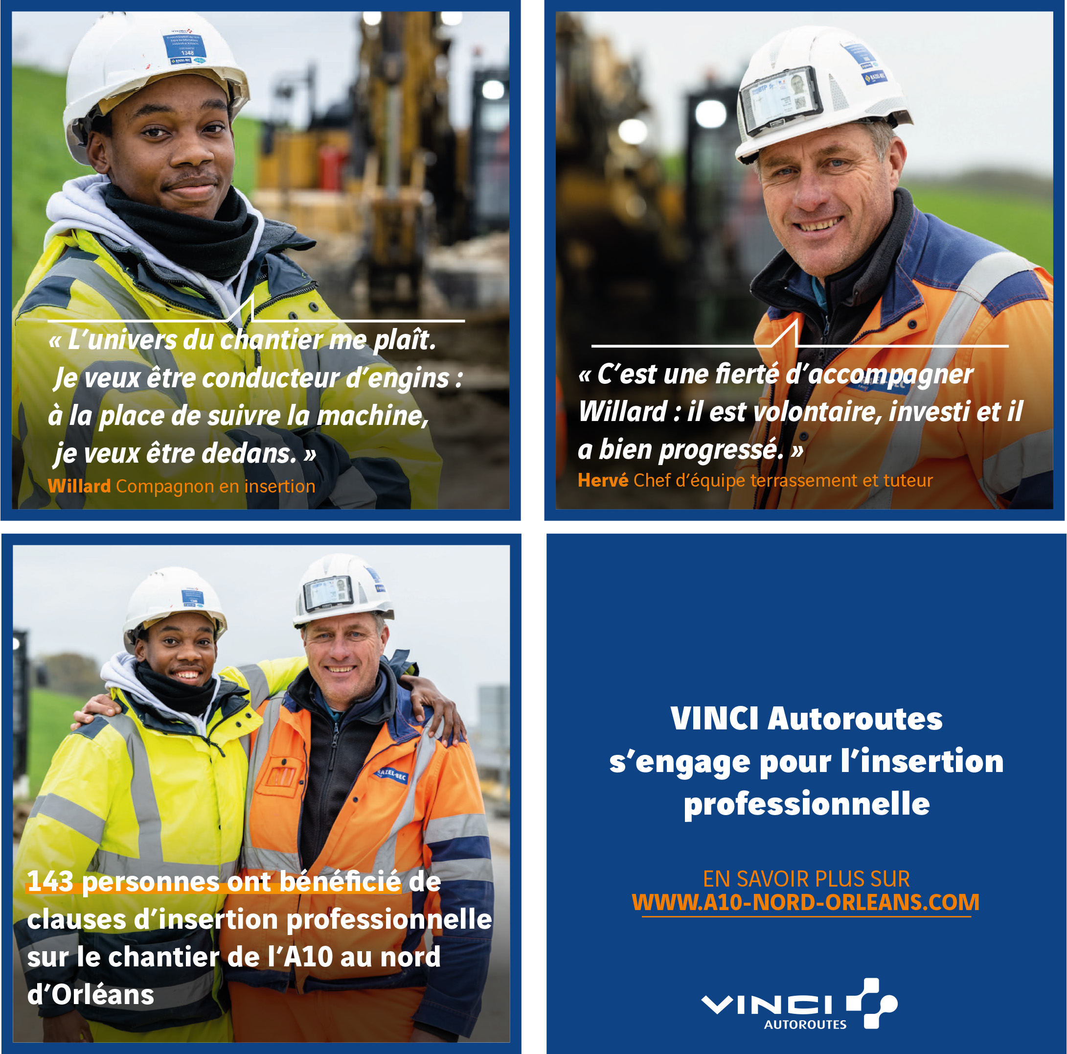 Willard Mongis, 22 ans est embauché depuis 8 mois en tant que manœuvre sur le chantier de l’A10 au nord d’Orléans. Passionné par le BTP son rêve est de devenir conducteur d’engins. Hervé Gauthier, chef d’équipe terrassement, apprécie son rôle de formateur auprès de ce jeune homme souriant et volontaire. Ce duo de la série « Regards croisés » témoigne sur l’insertion professionnelle.