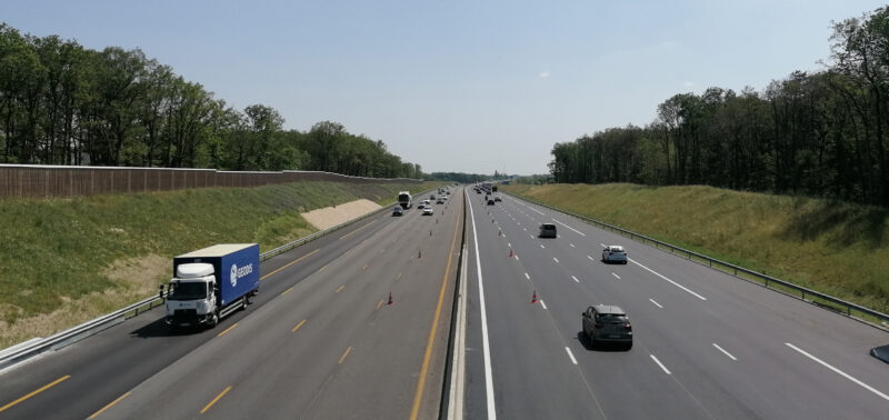 Depuis ce mois de mai, les équipes du chantier ont commencé à équiper les 4 voies et la bande d’arrêt d’urgence d’une nouvelle couche de roulement.