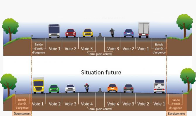 La largeur actuelle du terre-plein central impose de réaliser l’élargissement par l’extérieur, c’est-à-dire de construire la 4e voie juste à côté des 3 voies existantes au niveau de la bande d’arrêt d’urgence.