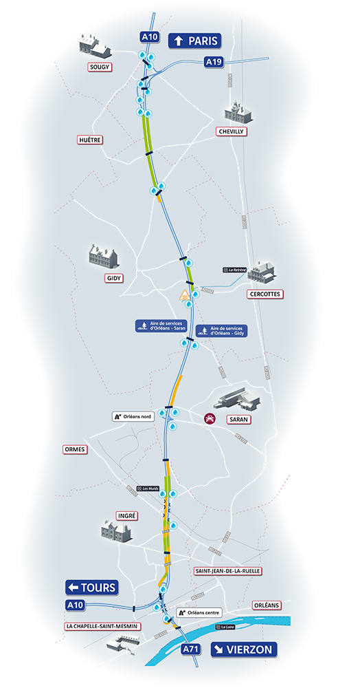 • la réalisation d’une 4e voie dans chaque sens de circulation sur les 16km de l’autoroute A10 situés entre les bifurcations avec l’A19 et l’A71 ;
